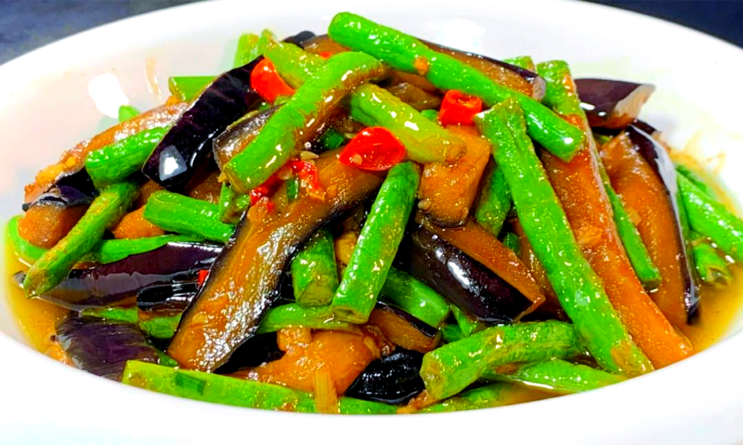 来源:简食记(知乎)原料:长茄子或者山茄,嫩豆角,红朝天椒,大蒜,蚝油,生抽,老抽,辣鲜露,葱姜。做法1:茄子切成长条,豆角切长段,朝天椒切粒,大蒜子切粒,葱姜分别切末。2:锅内加入足量清油,4成油温下入豆角焖煮,再将油温升至6成,下入茄子炸熟捞出控油。3:另起锅加入少许底油,放入大蒜粒小火炸制金黄,再放入朝天椒,葱姜炒出香味。4:烹入生抽,蚝油,辣鲜露炒出酱香味,加入清水烧开,先放入豆角烧至2-3分钟,再放入茄子略烧。5:加入白糖,少许老抽调色,再用水淀粉勾薄芡,翻匀即可出锅。【豉香豆角】