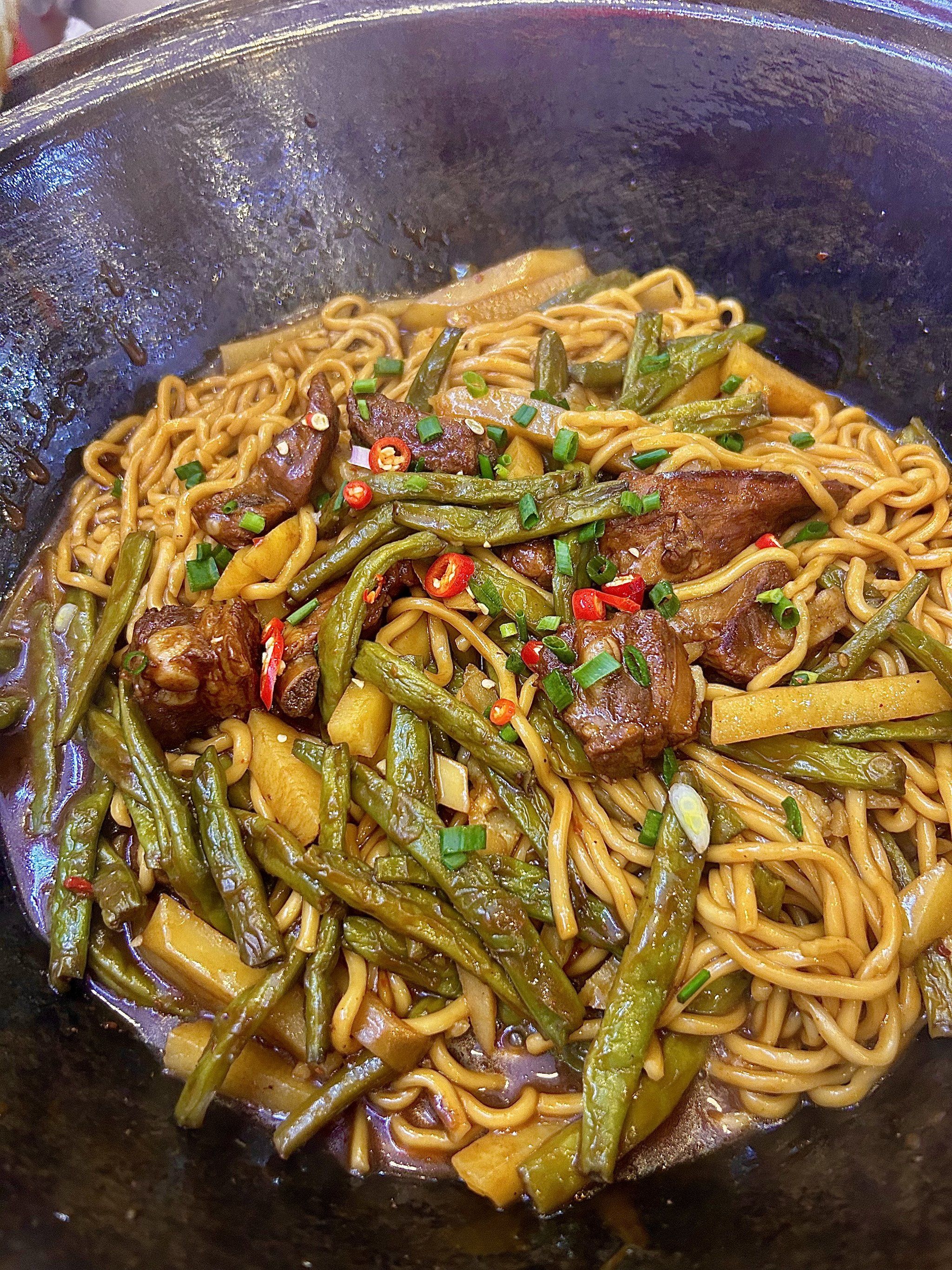 来源:美食杰【材料】 四季豆400克,面条(生)500克,熏肉200克,食盐1茶匙, 酱油2汤匙醋1/2汤匙植物油1汤匙 水适量【步骤】将豆角去筋掰成3~5厘米左右的段,清洗干净,熏肉切片备用 锅中加入少量植物油,放入切好的熏肉进行翻炒,待熏肉炒出香味后倒入豆角一起翻炒待豆角炒变色后加盐翻炒均匀,加入开水,水没过豆角, 锅中水烧开后,盛出一小碗备用,然后将蒸格放到豆角上面, 在蒸格上散上面条(面条在散之前从中间切断),盖上锅盖开始蒸, 大约蒸2分钟左右,打开锅盖,将步骤5中预留出来的豆角汤汁慢慢浇到面条上,盖上锅盖继续蒸, 浇完汤后,面条大约蒸3~5分钟左右(预估锅中的汤汁没有时,注意不要干锅)关火, 面条焖熟后,将准备好的醋和酱油倒入面条上,然后用筷子进行搅拌与锅底豆角拌均匀即可。【豆角肉丝】
