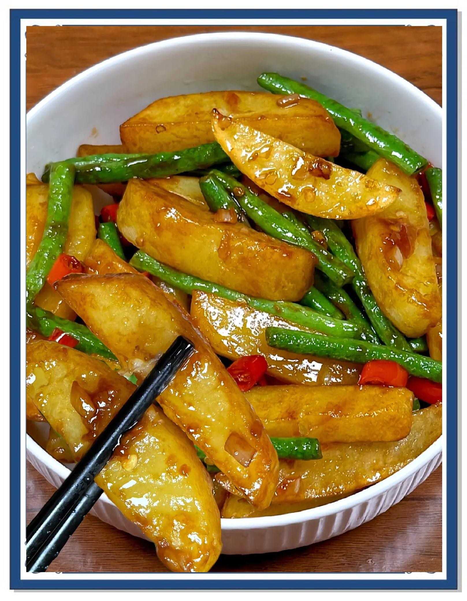 来源:八九网蚝油适量、 土豆 适量、 豆角 适量、 蒸鱼豉油适量、 盐适量、 高汤精适量、 西兰花适量、 淀粉适量、 姜末适量、 糖适量制作方法1.土豆切粗条,洗净控干水分,拍上淀粉;2.土豆七成热油一个一个下入炸定型,捞出,油继续烧到九成热,复炸一次。豆角也炸一下;3.西兰花焯水摆盘(也可以不要,主要为了装饰);4.油澄一下,倒出来,小心倒,把底下的沉淀留下;5.把蚝油,蒸鱼豉油,糖,和半饭碗水,一汤匙生姜末放入,小火熬,并用勺子画圈搅拌;6.冒泡泡的时候,把土豆和豆角放进去;7.小心翻炒几下,中火焖一会,少许盐,鸡精推匀即可8.最后装盘,就可以了,也可以用点香油。【炒豆角】
