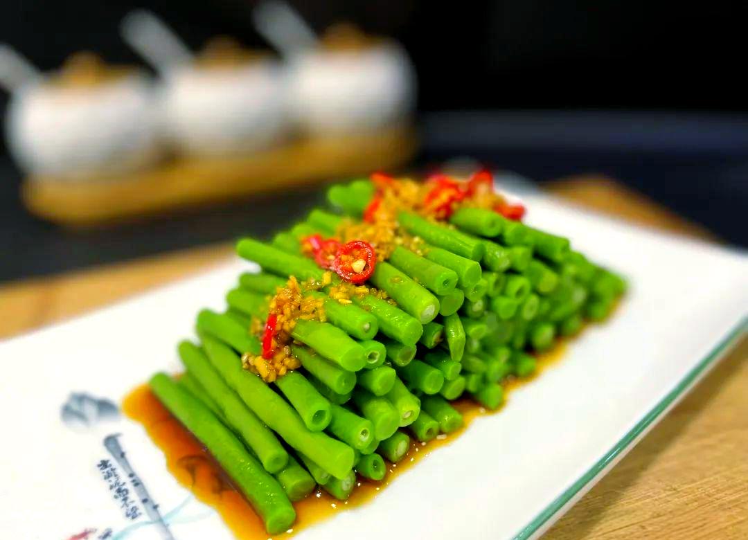来源:王刚(美食博主)用料: 长豆角 约300克、 生姜 1小块、 植物油 适量、 食用面碱 约1克、 食用盐 约6克、 味精 约2克、 米醋 约5克、 生抽酱油 约8克、 芝麻油 少许、 蚝油 约4克步骤 1 首先我们准备长豆角1小把(约300克) 去头去尾之后切成10厘米左右的段备用步骤 2 准备生姜1小块切成姜末备用 选择较老的生姜味道会更浓烈 下一步开始调味步骤 3 碗中加入适量的食用盐(约3克) 加入味精1小勺(约2克) 加入适量的米醋(约5克) 加入生抽酱油2勺(约8克) 加入少许香油(芝麻油)步骤 4 最后加入蚝油1勺搅拌均匀备用(约4克) 加入蚝油的目的是增加咸鲜味 同时增加汁水的粘稠度能够挂汁 下一步开始预处理步骤 5 首先我们把锅烧热 锅烧热之后加入宽油步骤 6 油温6成热之后下入处理好的长豆角 豆角断生之后倒出备用步骤 7 然后锅中加入适量的清水 加入适量的食用面碱(约1克) 加入适量的食用盐(约3克)步骤 8 然后下入断生的豆角焯水 大火烧开之后倒出用清水透凉备用步骤 9 焯水的目的是使其更加翠绿以及能够去除多余的油脂 冲凉是为了口感更加爽脆步骤 10 豆角透凉之后捞出摆盘即可 最后再淋上调好的姜汁即可上菜步骤 11 一道清香脆嫩的姜汁长豆角就制作完成步骤 12 下面开始技术总结 第一,姜汁开胃解暑、是川菜24味型中典型的冷菜系列步骤 13 第二、最好选择比较老的生姜,这样更加出味 长豆角最好将其煮熟一些,不喜欢过油的同学 可以直接用面碱加盐煮熟步骤 14 第三、姜汁调味只需要用姜末、盐、味精、醋即可 特点是清香爽脆开胃【蒸豆角】
