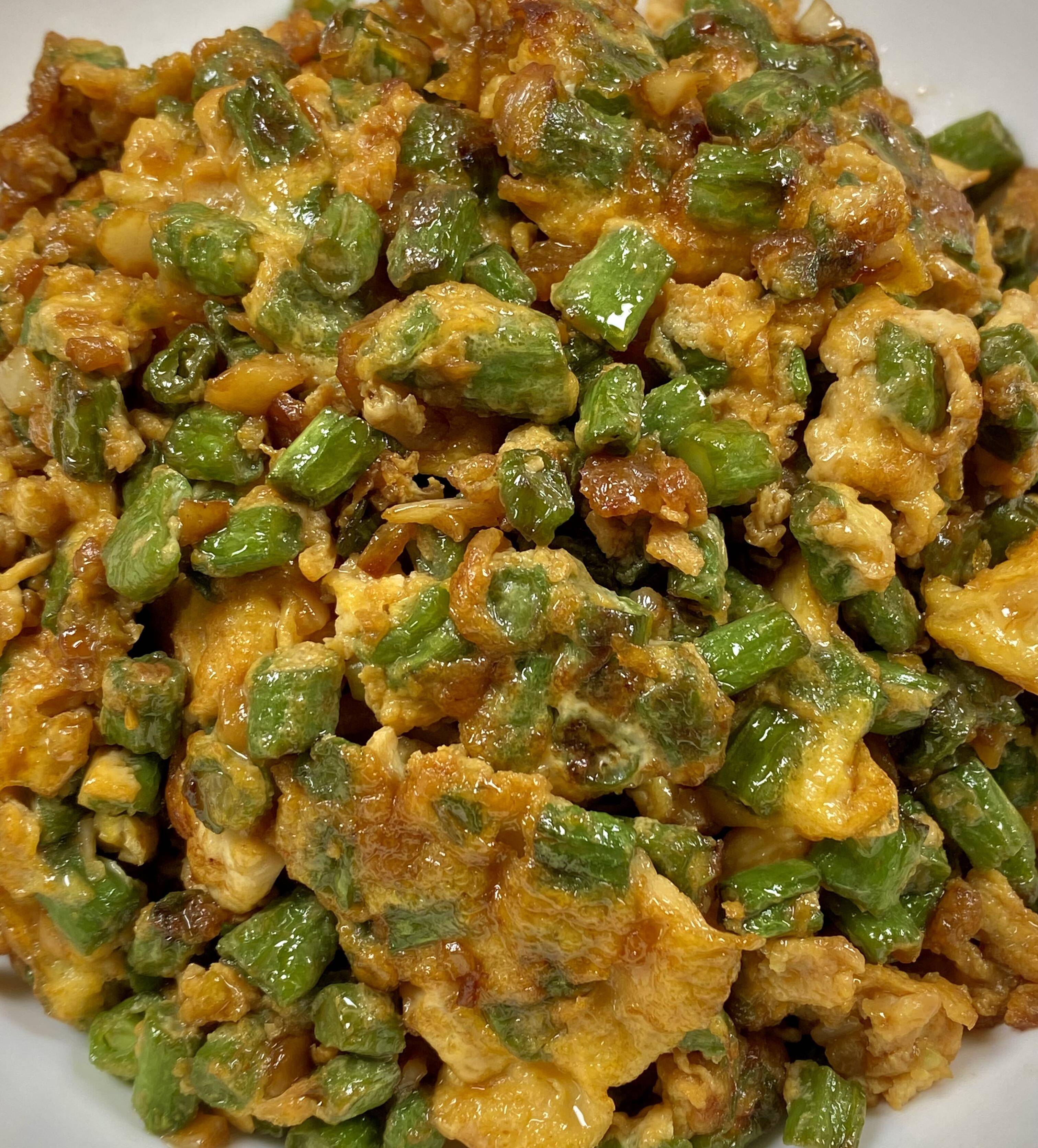 来源:大厨网原料: 长豆角、 鸡蛋、 蒜、盐、生抽、鸡精、油步骤1长豆角洗净,去掉头尾,切3-4厘米的段2蒜切末3鸡蛋加一勺水打散(家里没有鸡蛋了,所以打了2个鹅蛋)4锅中放油,油热后倒入打散的鸡蛋,翻炒5鸡蛋基本成形后,倒到碗中备用,不用炒到完全熟,不用搅太碎6锅中放油,倒入一半蒜末爆香(想放葱姜也可以),倒入豆角,翻炒7加入盐和少许生抽,继续翻炒至豆角完全变翠绿色并有些软8将鸡蛋倒入,用锅铲断成大块,加入鸡精、另一半蒜末,翻炒均匀,即可出锅9装盘【姜汁长豆角】