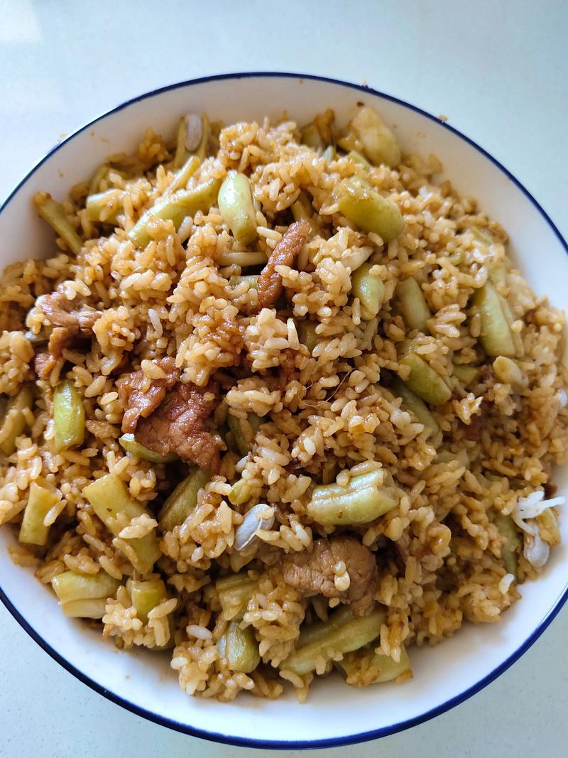 来源:美食杰主料: 大米300克、 胡萝卜2根、 猪肉200克、 豇豆1把辅料: 葱1小段、 老抽1汤匙、 姜1小块、 生抽2汤匙、 植物油2汤匙、 水适量1.准备好所有食材2.把大米淘洗干净放进电饭锅里备用,不要开始煮饭哦3.豇豆和胡萝卜切丁,红红绿绿的很好啊4.猪肉切块,将肥瘦分开5.开火热油,放入葱和姜炒香6.加入肥肉煸香7.加入瘦肉小炒,肉变色后加入1汤匙老抽,2汤匙生抽,小心油四溅,我就是因为怕油溅到手上所以不敢靠太近拍照8.加入豇豆和胡萝卜丁继续炒,觉得差不多了就可以关火了,我喜欢吃软的,所以炒的差不多快软了才关火,因为之后要和米饭一起焖,会更软9.关火之后把菜和米放在电饭锅中一起搅,然后放水,大概刚没过米和菜就好10.打开电饭锅开始焖啦,和平常焖米饭一样11.跳闸之后再稍等片刻就可以出锅装盘啦【烧豆角】