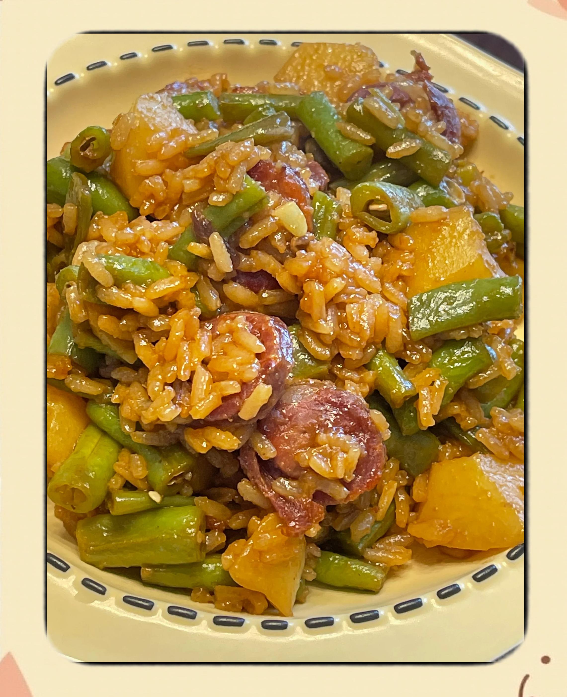 来源:网络原料:米饭、豆角、五花肉、萝卜干、香菇、葱花、盐、酱油、胡椒粉、鸡粉。做法步骤:第1步、米饭先蒸好。第2步、材料:豆角、五花肉、香菇、萝卜,全切成丁,最后是葱花。第3步、先炒香肉丁。第4步、倒入香菇和萝卜干炒香。第5步、再放入豆角翻炒,加入适量的盐。第6步、撒点水。第7步、将米饭盛入锅中,调至最小火,上盖焖5分钟。第8步、开盖,拌匀。第9步、加入适量的酱油、胡椒粉、鸡粉、最后撒入葱花,拌匀即可。第10步、成品。省时省力,下班回来吃口有菜搭配的焖饭最满足。【豆角炖鸡肉】