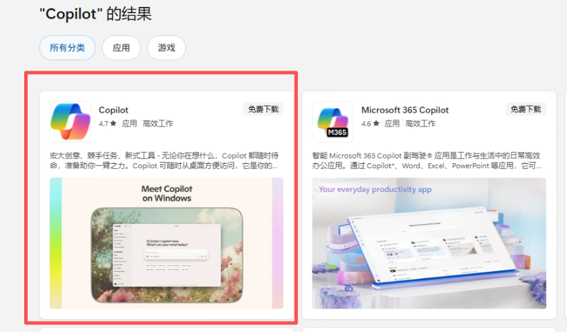 ▼这时候再Micro Soft商店原本在中国不提供下载服务的Copilot就可以进行下载了。