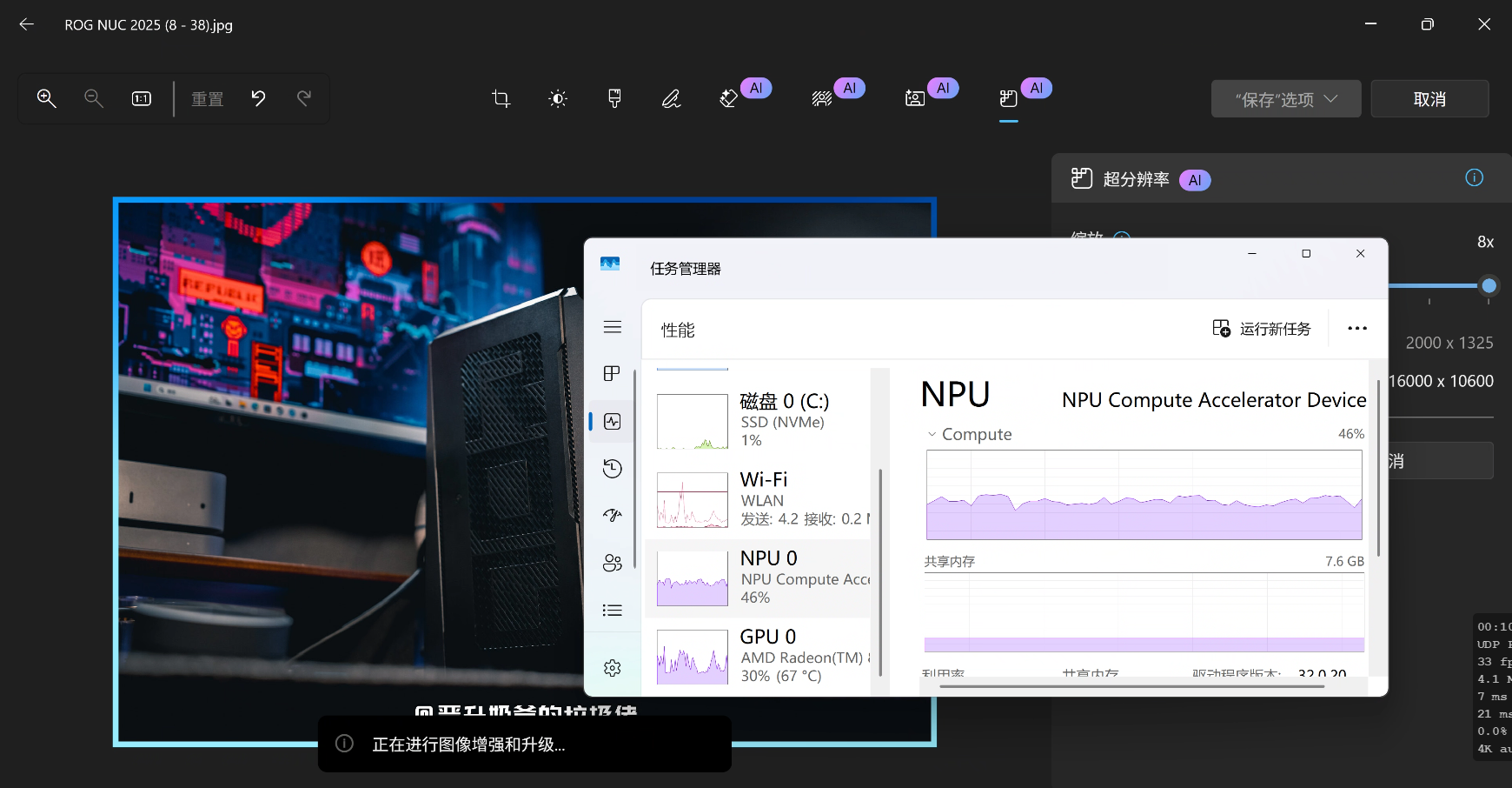 ▼当我们进行超分辨率时,可以看到NPU与GPU同时在运作,很轻易的就能获得一张更高分辨率的照片了。