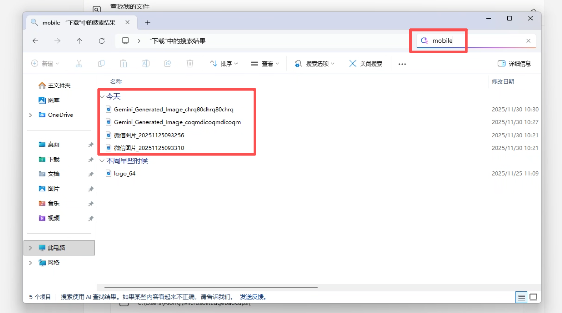 ▼而这四个文件确实都是我今天刚刚处理的几张手机素材照片,同时在资源管理器的底部,我们也能看到「搜索使用AI查找结果」的字样。强的Windows搜索可以理解词语或短句的上下文含义,让搜索更加自然和直观。