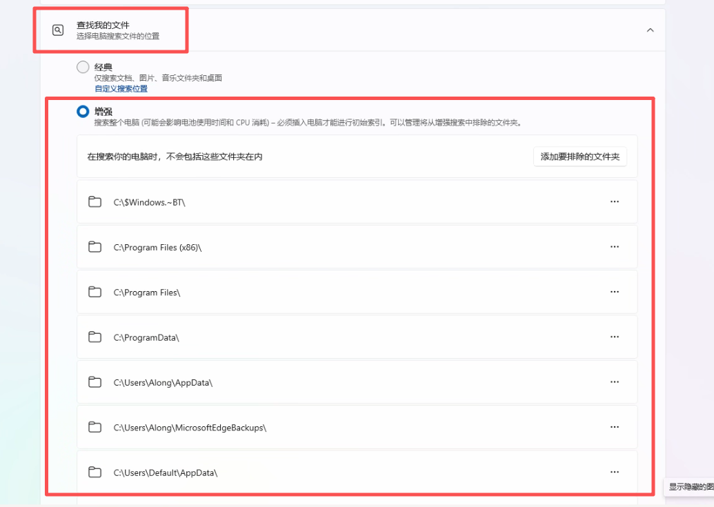▼默认「经典」模式下,仅搜索文档、图片、音乐、桌面四个文件夹,如果要搜索更多,则要开启「增强」。