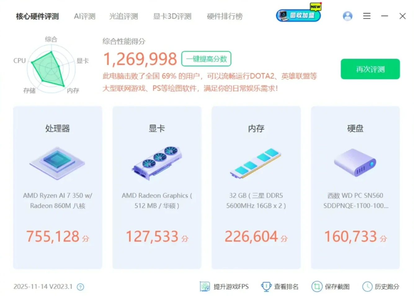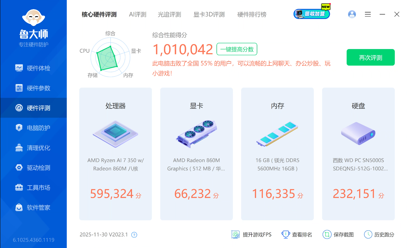 ▼用鲁大师来跑一个整体分数,最终成绩101万分,这里的成绩实际上是偏低的,在插两条16GB内存之后处理器性能与核显性能都会有比较明显的提升,个人猜测可能与NPU、GPU都要使用到共享内存有关。