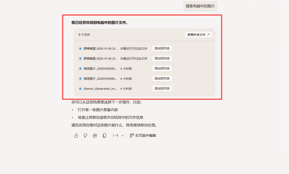 ▼虽然在Copilot中无法直接通过语义搜索图片,但是它给出了方案,在文件资源管理器里面进行搜索(这个我以前真不知道,都能这样搜索了?)