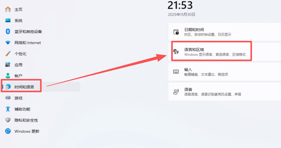 ▼进入到时间和语言功能标签页,找到语言和区域功能。