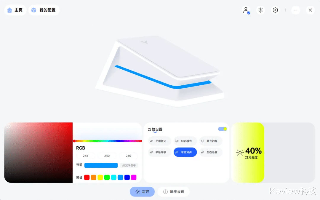 座充接入A hub全家桶生态,可切换多种RGB幻彩光效,还能通过驱动去切换灯效及灯光亮度,可以说是把桌面电竞感拉满。