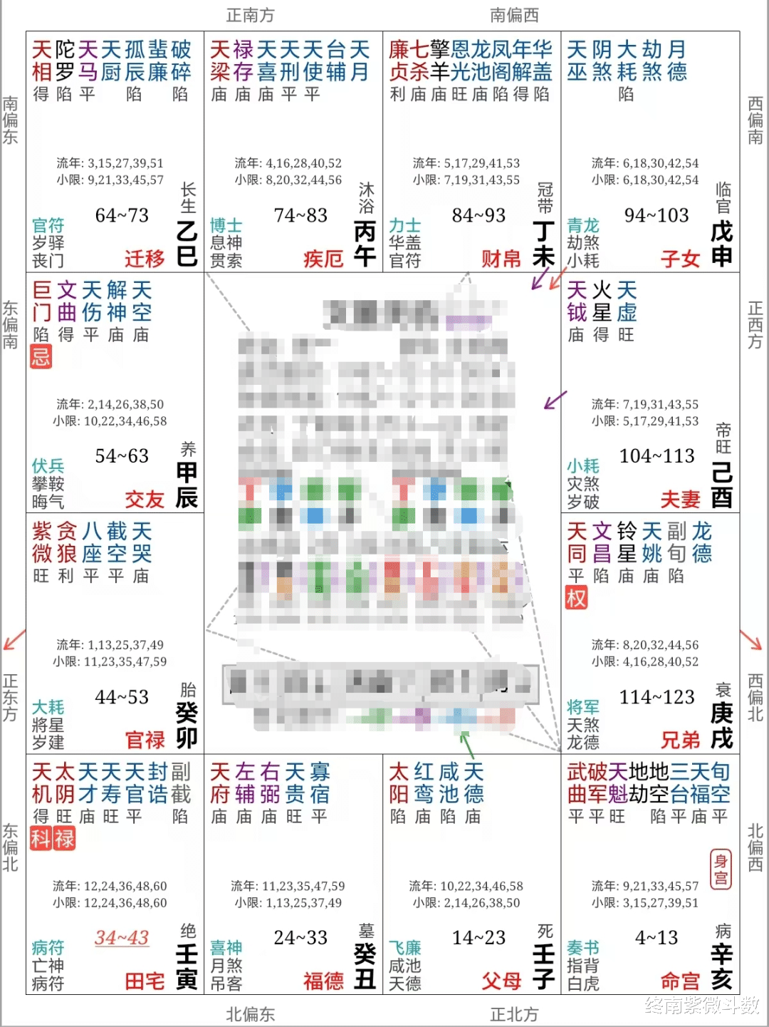 比如,夫妻宫坐七杀星,还有天刑星,廉贞化忌入迁移宫冲命宫,如果迁移宫还有一个生年忌、自化权、视同自化忌等等乱象,那么我们可以说,这种情况就是非常严重的克妻状态。