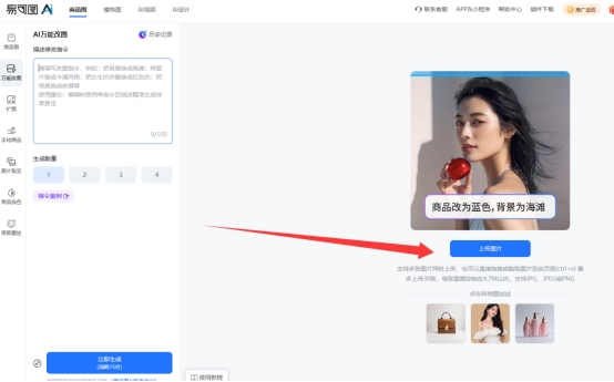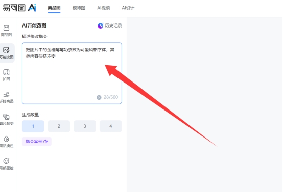 如果不想在 PS 中反复修背景,其实可以直接使用易可图完成图片改字。AI万能改图支持通过简单描述,对图片中的文字进行修改,整个流程比较直观: