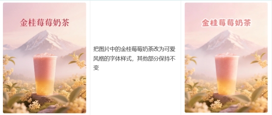 例如:把图片中的金桂莓莓奶茶改为可爱风格字体,其他内容保持不变,又或者是把图片左上角的双11改成双12,其余文字不变。