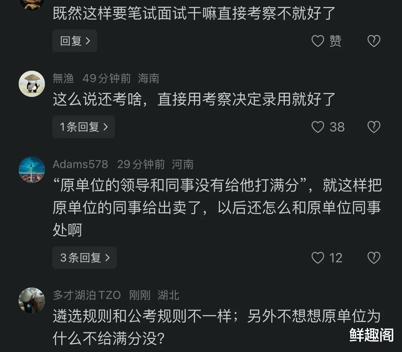 这件事情曝光后,在网络上引发了不小的关注和争议。一部分网友认为,如果考试成绩第一都无法保证通过,那么考试的衡量作用体现在哪里?还有网友直言,考察环节的评分依据、加分项目和淘汰规则,应该在遴选公告中尽可能明确列出,而不是在结果出炉后进行解释。