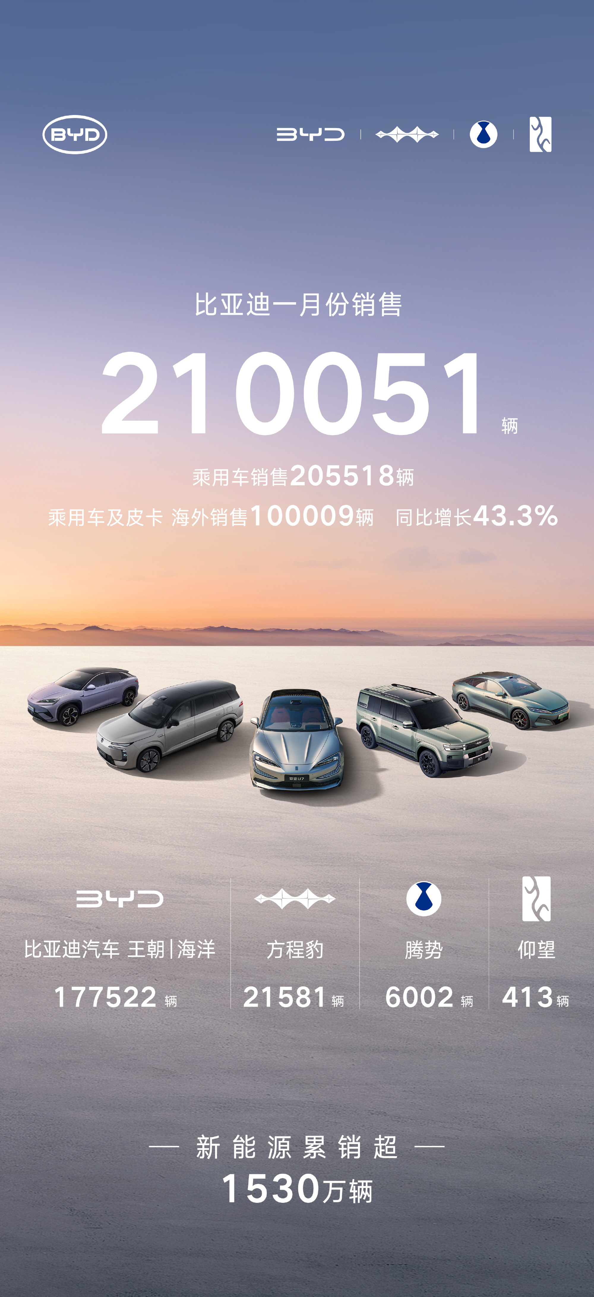 自2021年6月至今,比亚迪已连续56个月蝉联国内新能源销量冠军,这种长期、稳定的领先,在当前高度内卷的市场环境下,含金量不言而喻。截至目前,比亚迪新能源累计销量已超过1530万辆,持续用规模与可靠性赢得用户选择。不仅在国内市场保持强势,比亚迪的全球化进程同样提速。1月海外销量突破10万辆,同比增长43.4%,在多个核心海外市场持续扩大影响力,全球竞争力正在加速释放。进入2026年,比亚迪以明显优势抢跑开局,不仅进一步拉开与其他品牌的差距,也为全年新能源市场竞争奠定了清晰而强势的基调。