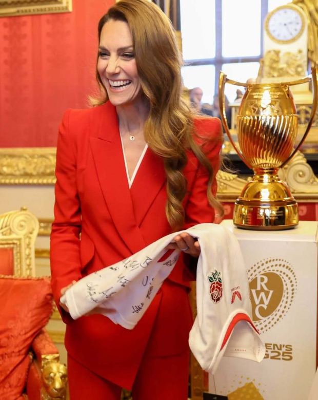 1月15日英国王储妃凯特作为橄榄球联盟的皇家赞助人,在温莎城堡为夺得2025年女子橄榄球世界杯冠军的英格兰队举办欢庆招待会,一身中国红西服套装把人惊艳,大波浪卷发也加分。