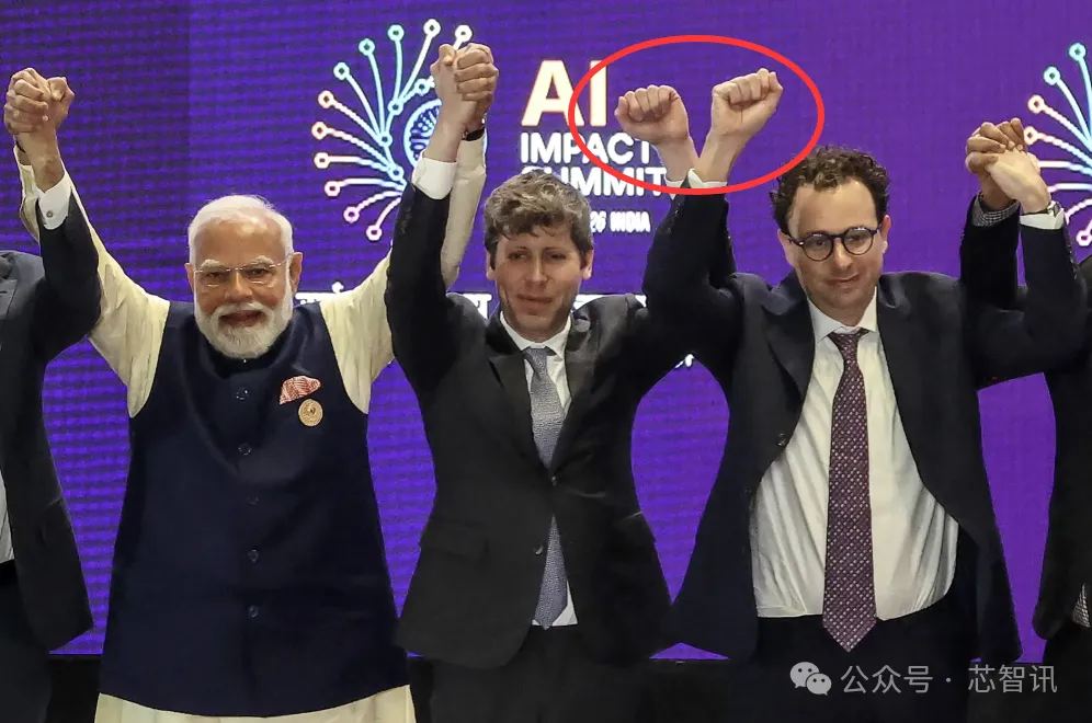 值得一提的是,在此次峰会上展现全球科技创新企业的共同承诺时刻,却变得异常尴尬:当印度总理莫迪邀请发言人手牵手举起以示团结时,台上所有高管都照做了——除了OpenAI CEO山姆·奥尔特曼和 Anthropic CEO 达里奥·阿莫迪(Dario Amodei), 他们只是各自举起了拳头。