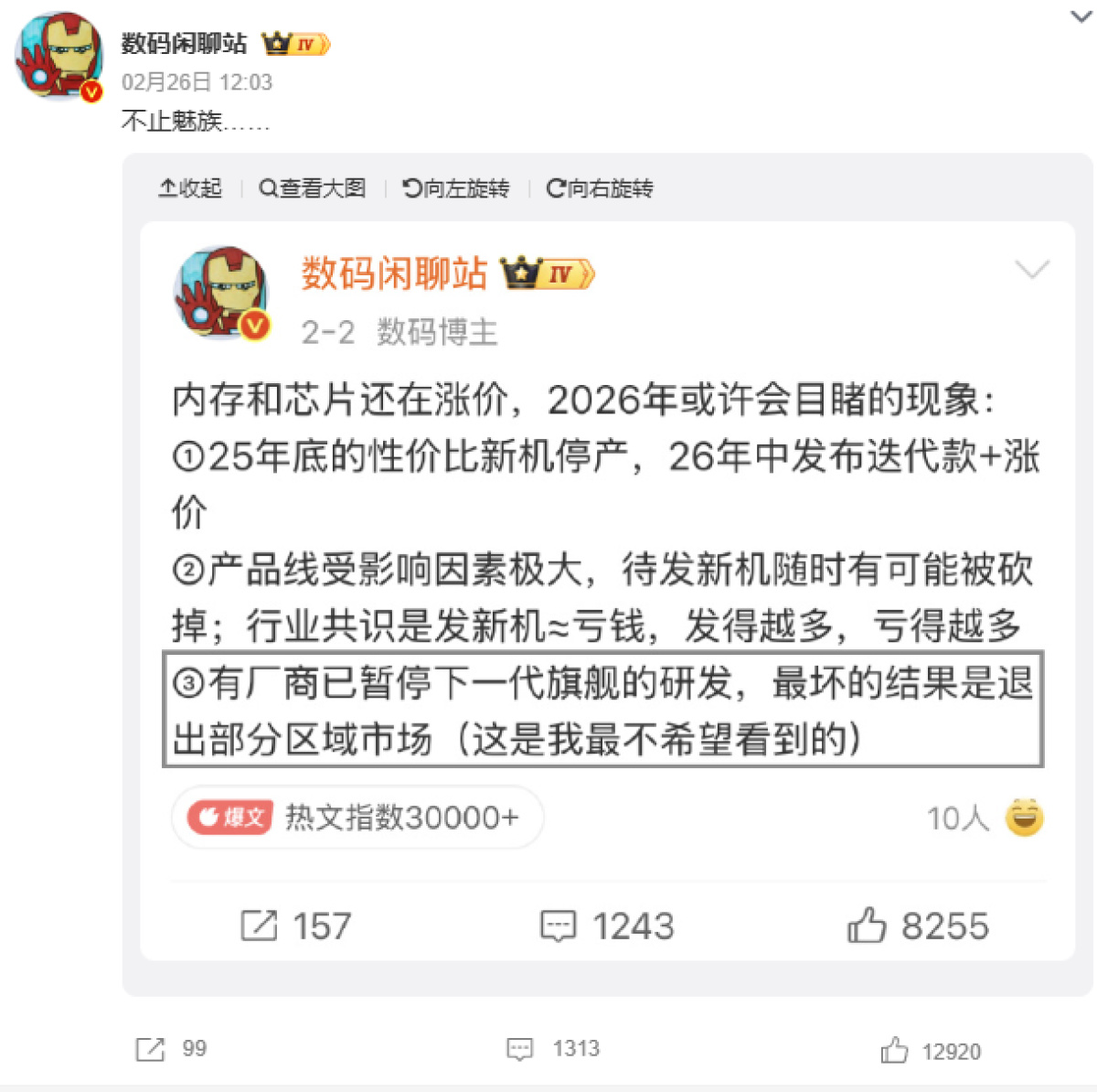 魅族的手机业务的暂停,也引发了众多行业内的讨论。博主@数码闲聊站 在魅族发布公告后发文表示:接下来,有此境地的可能不止魅族。他在早前就透露,2026年随着内存和芯片价格的上涨,高性价比机型可能会面临停产,而众多机型都会进行涨价。