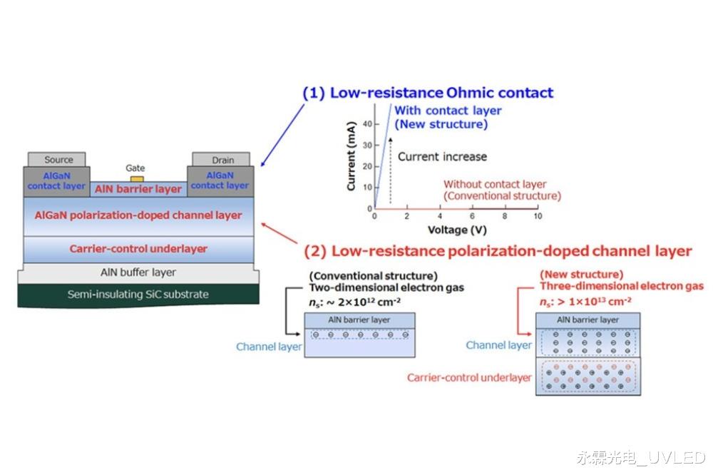🔬 技术一:利用 AlGaN 接触层实现低电阻欧姆接触在传统的晶体管结构中,电极是直接形成在 AlGaN 沟道层上的。当铝(Al)组分增加时,电极与半导体之间的能量势垒会升高,导致很难获得欧姆接触,从而限制了漏极电流的通过。