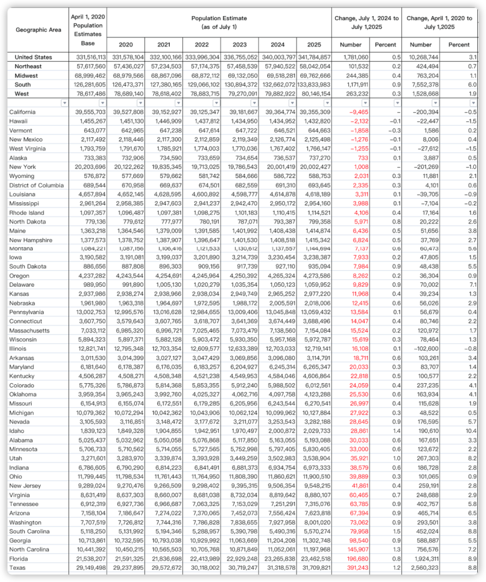 上图是联邦人口普查局公布的具体数据,从图中可以看出,过去一年,即2024年7月-2025年7月全美人口共增长了178.1万,各州人口变化数据见红色字体,本人在表格中嵌入公式,并按照各州增长的人口数量多少进行排序,增长人口数量最多的五个州分别是:得克萨斯州(39.12万人),佛罗里达州(19.66万人),北卡罗来纳州((14.59万人),佐治亚州(9.85万人)和南卡罗来纳州(7.99万人),除了NC和GA属于摇摆州外,其余三州都是红州,而且TX和FL增长的人口数据,显著多于其他州。
