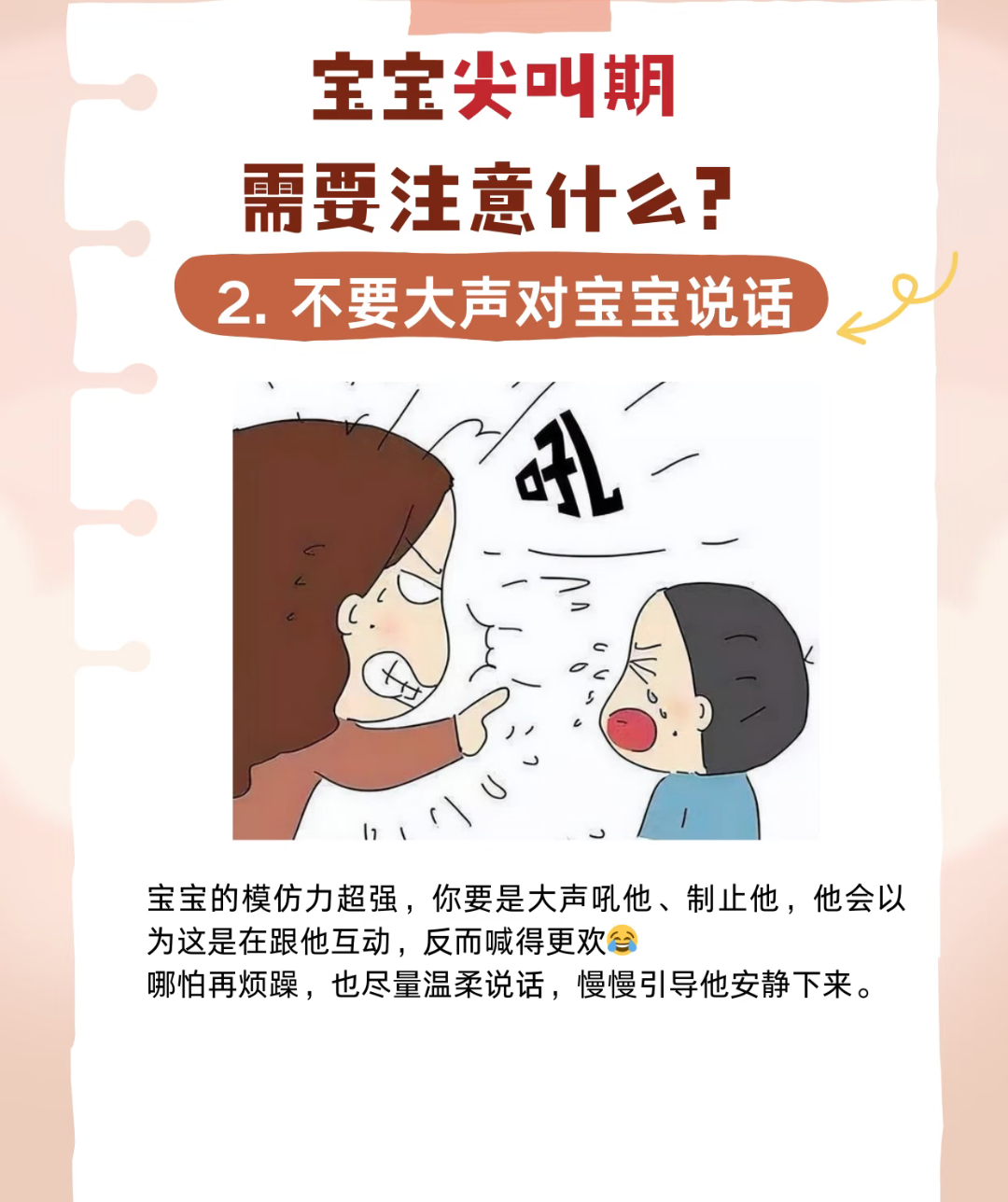 还有个小提醒,当宝宝尖叫时,家里人最好保持一致的态度,不要有人表现出过度的兴奋或者大笑,因为宝宝很敏感,他会觉得“原来我这样叫能让大家这么开心”,反而会强化这个行为。平静温和地对待,他会慢慢发现,原来不尖叫,用其他方式也能很好地跟爸爸妈妈交流。