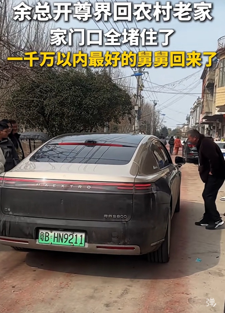 往年大家熟悉的问界M9、智界S7这次统统没出现,出现在村口的是一辆挂着粤牌、气场两米八的尊界S800 。
