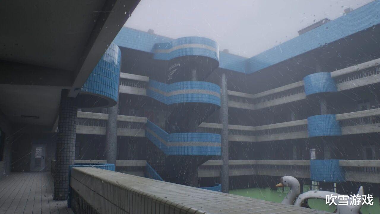 玩家手持一台带有VHS录像机粗粝质感与噪波效果的复古相机,化身孤独的漫游者,步入一个个被按下静音键的世界。脚步在空旷的学校走廊里激起清晰回响,推开一扇吱呀作响的锈蚀铁门,门后是弥漫着洗涤剂与陈旧水汽味道的公共澡堂;日光灯管在头顶发出持续的、令人昏昏欲睡的嗡鸣,而窗外,是永远定格在金色黄昏时分的天空。