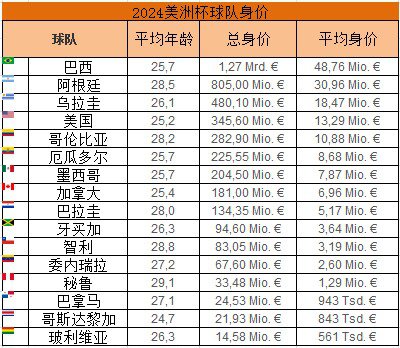 2024美洲杯明早揭幕 球队身价夺冠数据分析