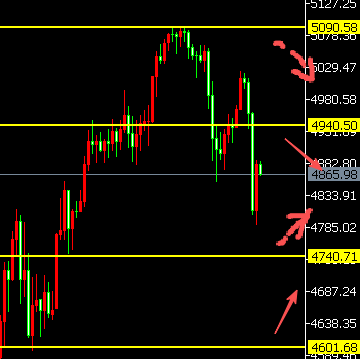 昨天的走势上面,先是急速走高,最高触及到了5090附近后。再遇阻回落,晚间跳水后,今天回升二度遇阻,直线跳水,跌至4790附近,跌幅达到了300美金。
