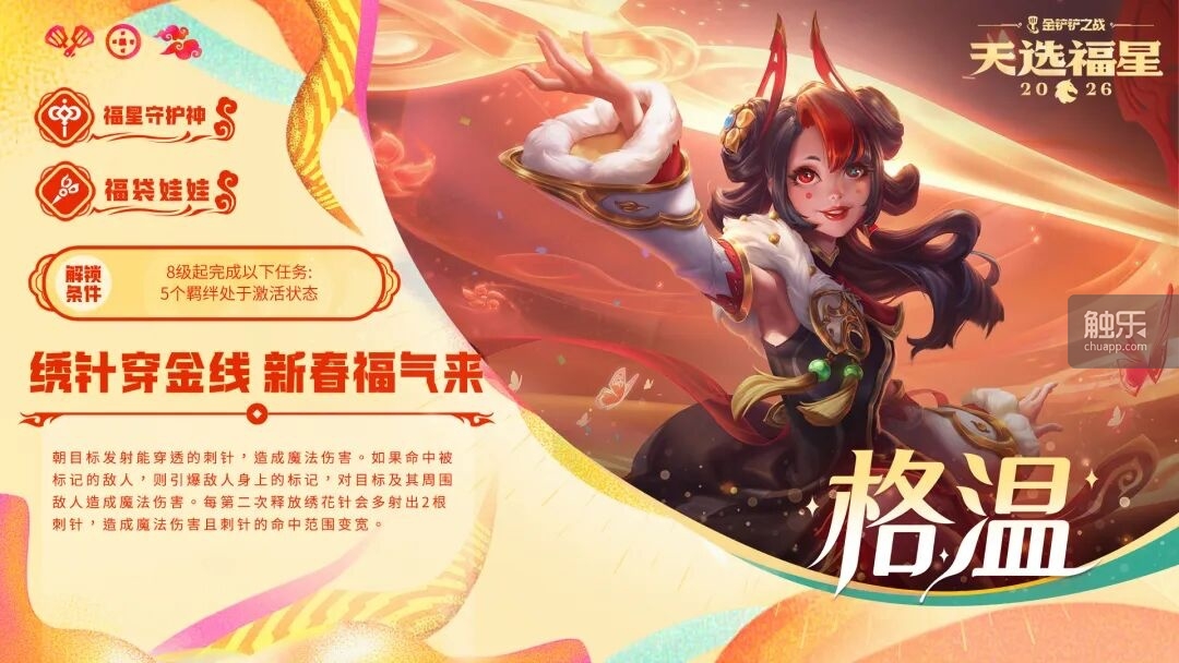 今年的福星也不例外,在保留新春使者、红包雨等玩法的基础上,还基于现版本的弈子解锁机制,推出新的“福星守护神”特殊弈子。玩家通过完成对局任务即可解锁,其上场不占用人口,还能享受阵容已激活羁绊的加成,既让阵容搭配更灵活,也让对局的策略性与爽感再上一层。
