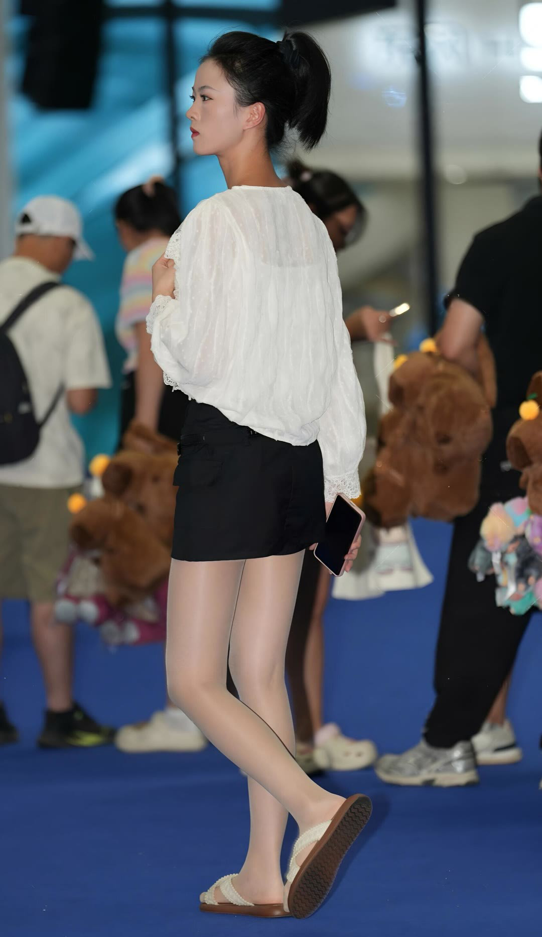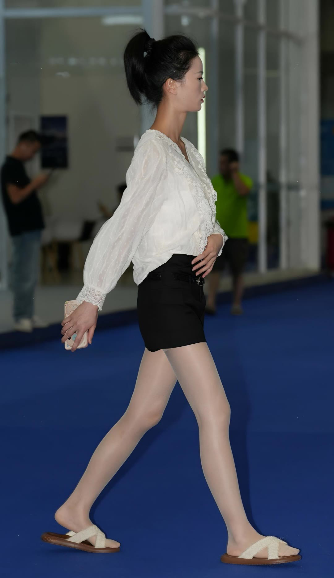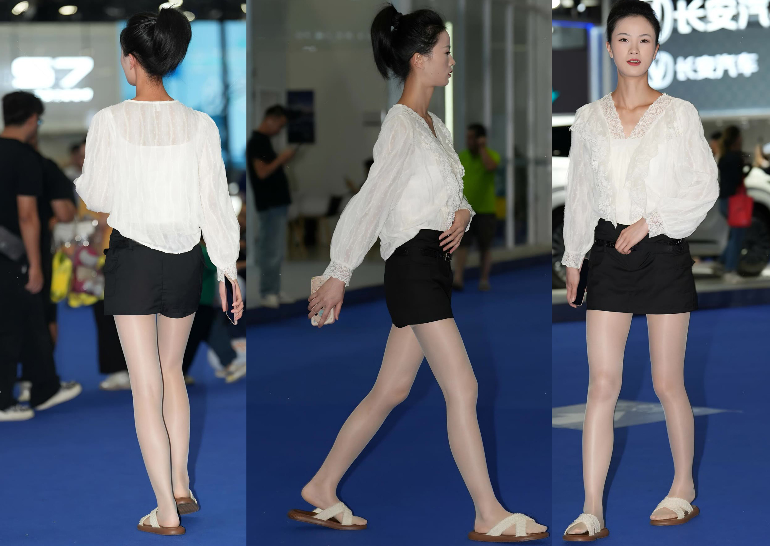 不是常见的紧身裙高跟鞋,而是一身像刚从咖啡馆溜达过来的打扮:简单的白上衣,利落的黑色热裤,一头长发清爽地盘起。最让我停顿的,是那双踩着米色凉拖鞋、裹着肉色丝袜的脚——它就这么随意地站在冰凉反光的地板上,与周围那些小心翼翼踩着细高跟、生怕划伤车漆的氛围,格格不入。