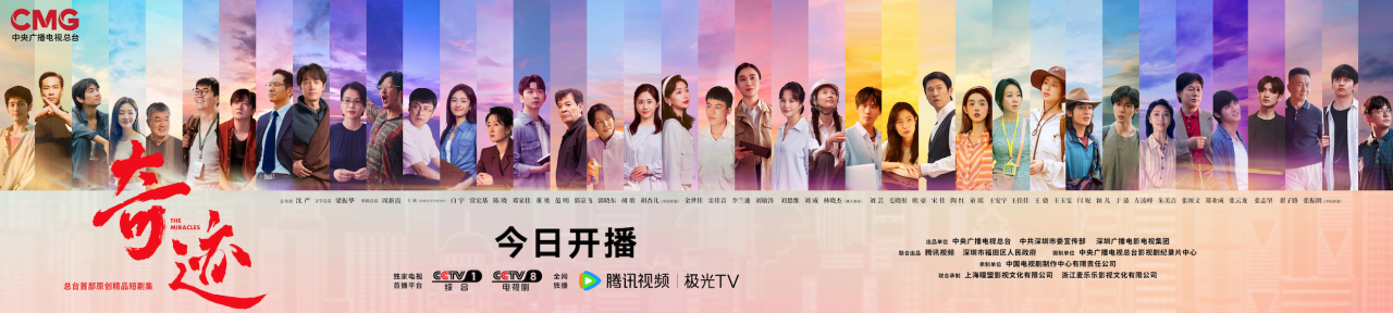 中央广播电视总台首部原创精品短剧集《奇迹》今日登陆CCTV-1晚八点黄金档首播,并将于2026年1月12日登陆CCTV-8晚七点黄金档播出,腾讯视频全网独播。该剧由中央广播电视总台、中共深圳市委宣传部、深圳广播电影电视集团出品,深圳市腾讯计算机系统有限公司、深圳市福田区人民政府联合出品,中央广播电视总台影视剧纪录片中心摄制,中国电视剧制作中心有限责任公司承制,上海瞳盟影视文化有限公司、浙江麦乐乐影视文化有限公司联合承制,集结总导演沈严、文学总监梁振华、剪辑总监周新霞等金牌幕后,更有演员胡歌、宋佳、雷佳音、闫妮、白宇、陈晓、张颂文、童瑶、王安宇、于适等主创惊喜加盟。
