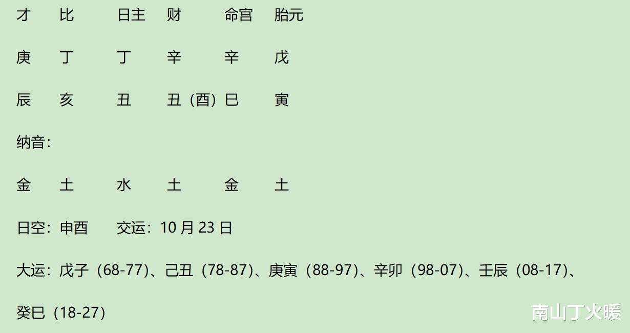 此人虽然身弱,但是成了格局:伤官生财格(胎元戊伤生2辛偏财、1庚财),财局(地支巳酉丑丑财局)。乘气(立冬后6日,戊土司令,戊土透而为用)而格局层次高。有文昌(丁日主以酉为文昌)、将星(日支丑以酉为将星)、天乙贵人(丁日主以酉亥为天乙贵人、庚年人以丑为天乙贵人)等。