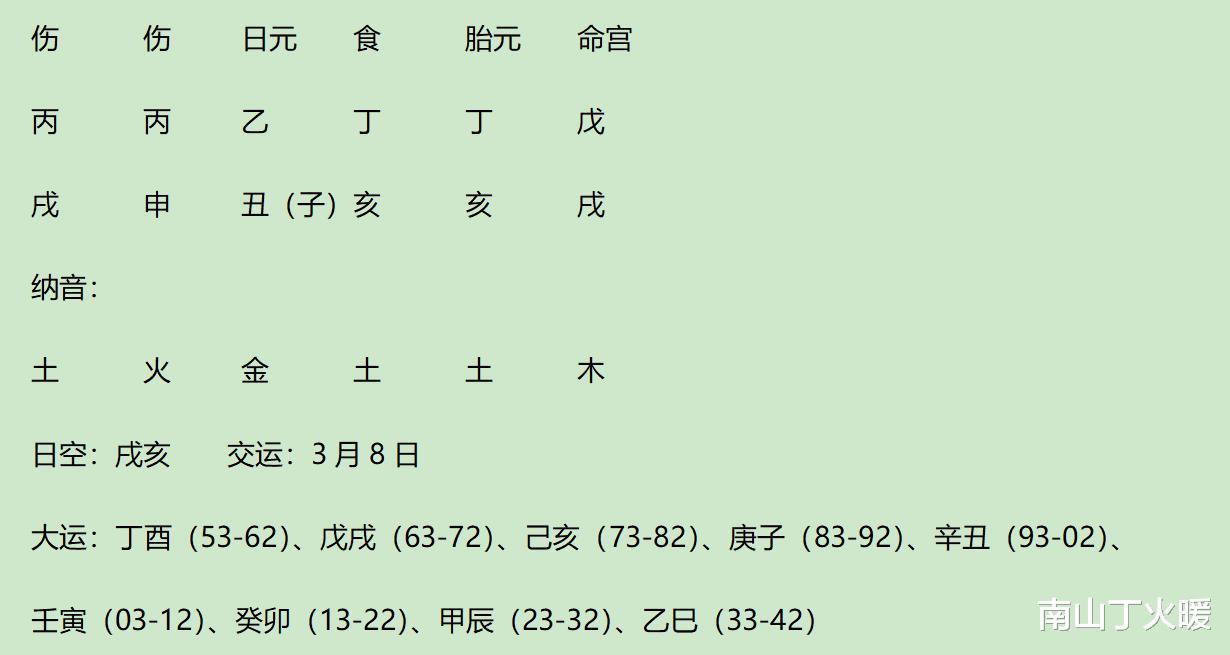 此人虽然身弱,但成格局:食伤生财格(2丙伤、2丁食生戊财)。有乙丙丁三奇。有文昌(丙年人以申为文昌)、将星(戌年人以午为将星)、天乙贵人(丙年人以亥为天乙贵人,乙日主以申为天乙贵人)等吉的神煞。