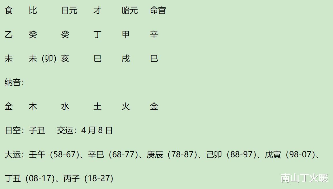 乙日主,得亥亥子生,命宫纳音木助,1强根力量。身弱(低于2强根力量)。