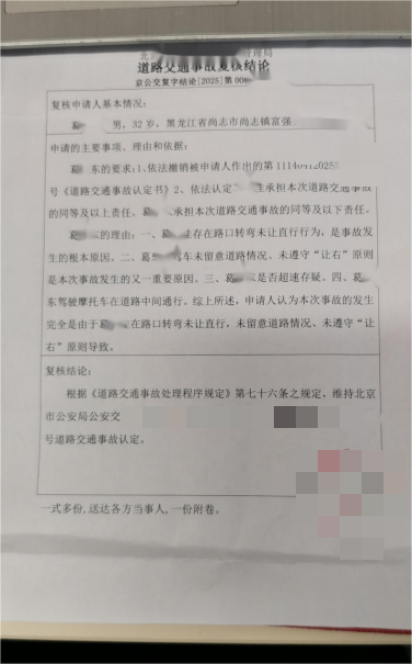 2025 年 10 月 30 日收到认定书后,葛某东 11 月提交复核申请,北京市某交通管理局 11 月 4 日出具《复核受理通知书》,但最终维持原认定。更让他不解的是,复核阶段有工作人员以 “需给对方让 2.2 米” 解释定责,可《北京市实施〈中华人民共和国道路交通安全法〉办法》第五十五条仅规定 “人力三轮车应在距道路右侧边缘线向左 2.2 米内行驶”,与交管工作人员给出的“摩托车需让行 2.2 米”的法条解释无关。