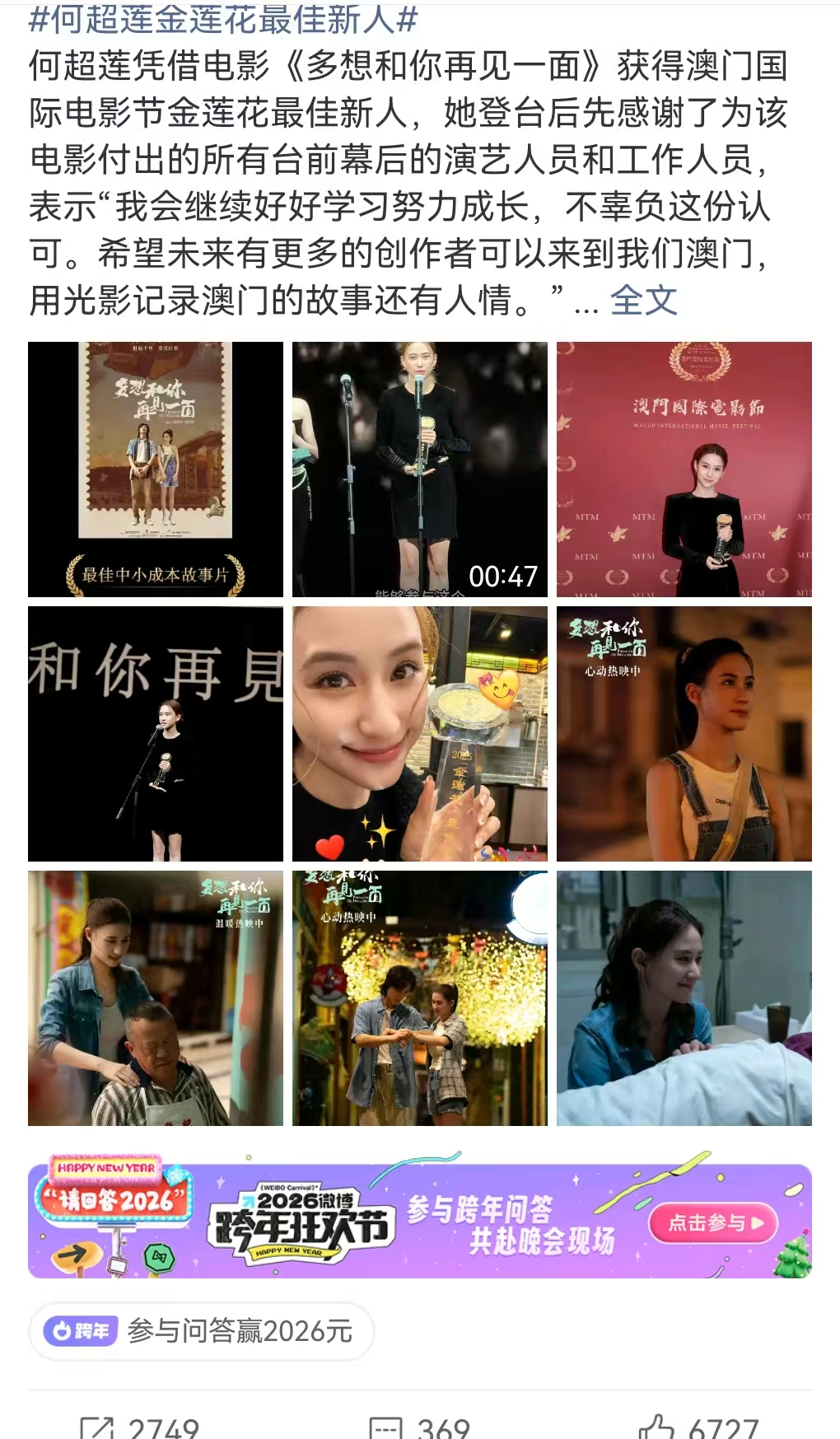 12月23日,澳门国际电影节的舞台上灯光璀璨,众星云集。在这样一个星光熠熠的场合,何超莲凭借电影《多想和你再见一面》成功斩获金莲花最佳新人奖,这一消息如同一颗重磅炸弹,瞬间在娱乐圈炸开了锅。当她的名字被宣布的那一刻,全场掌声雷动,镜头纷纷聚焦在她身上,记录下这荣耀而难忘的瞬间。