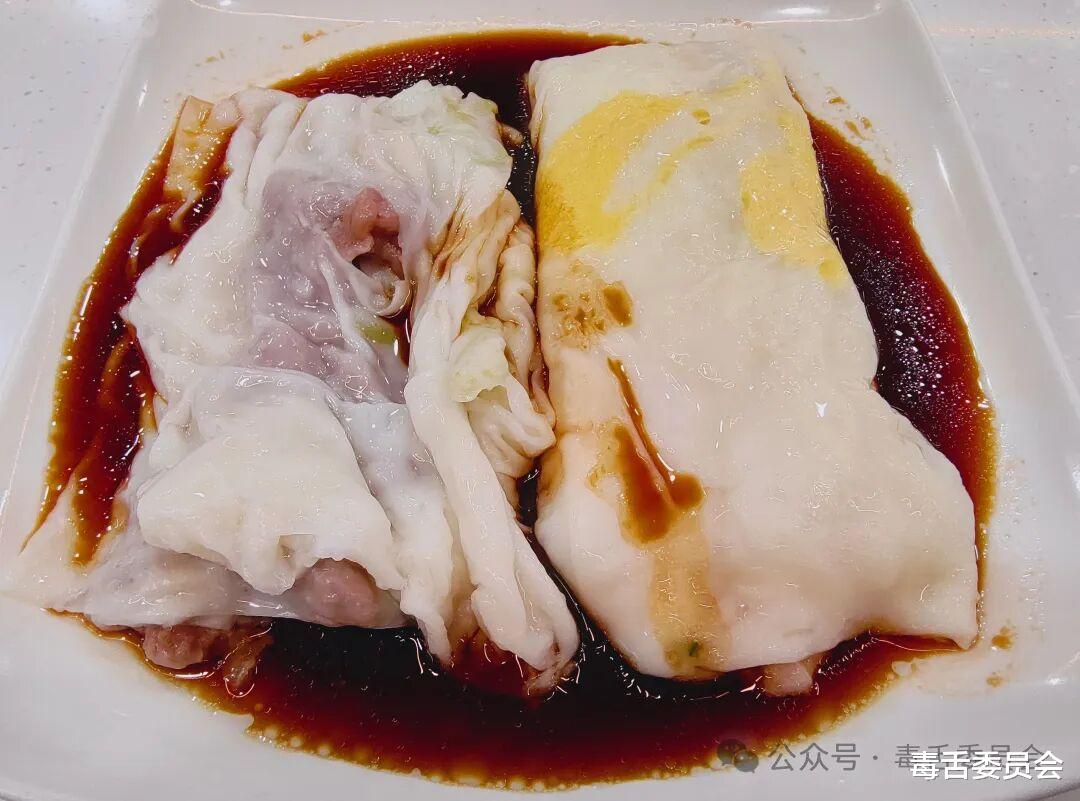牛肉鸡蛋肠。牛肉鸡蛋肠上来后,我没有想到会是这种结局!一条牛肉肠和一条鸡蛋肠就这样勉强挤在一起?它们从来就没有在一起过?我都开始怀念那种鸡蛋包裹着牛肉,牛肉拥吻着鸡蛋的做法。肠粉、牛肉和鸡蛋三方完全融合,这种缠绵游戏才配得上是一道牛肉鸡蛋肠吧?如今这种粗暴的做法,不是同床异梦,还能是什么?好吧,我就当点的是 两道肠粉吧······首先试试牛肉肠。肠粉的质感和味道跟斋肠区别不大,那就直接说说牛肉吧。这牛肉还是值得一赞的,没有为了嫩滑而把牛肉“阉割”,咀嚼起来还是能讨牙齿欢心的。更可喜的是,这牛肉不但肉香味足够,还能渗出一点清甜的味道。而里面的韭黄,能让牙齿提提神,也让味蕾振奋一下······这道牛肉肠还是值得的。再试试鸡蛋肠。我没想到这里的鸡蛋居然蛋香味浓郁!有点儿土鸡蛋的风味。而那原本缺失米香味的肠粉,在这香味十足的鸡蛋加持下,也变得精彩起来!真是一对优秀的互补啊。最后我跟这道“同床异梦”的肠粉和解了,那就各自各精彩吧!