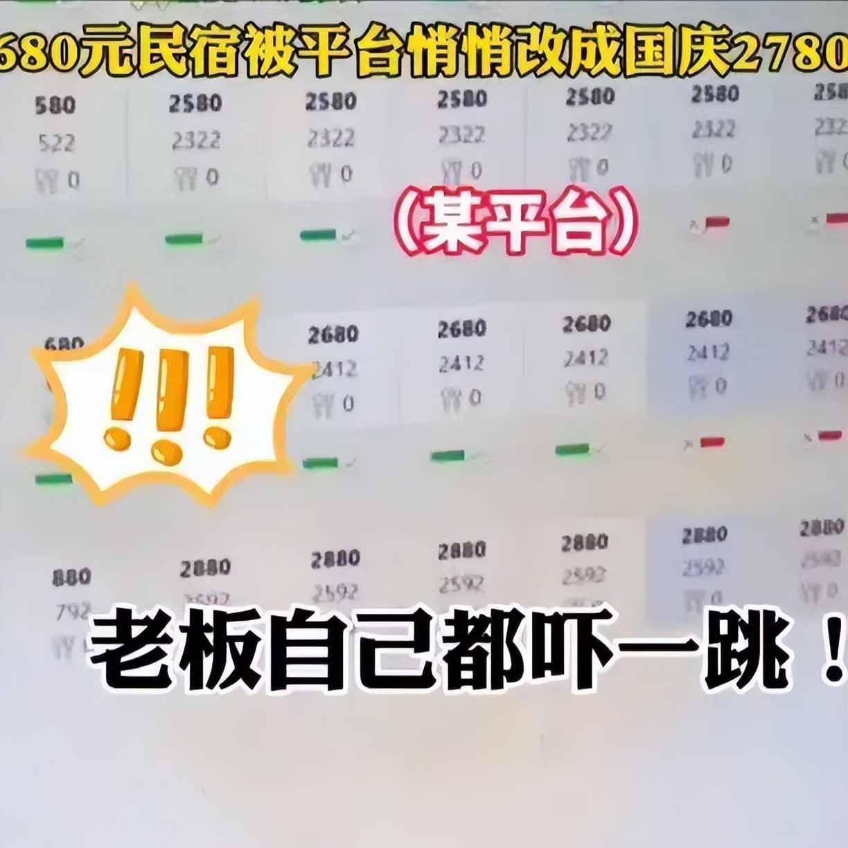 浙江丽水某民宿的女老板,打开某平台的页面,想看一下国庆订房数据。结果让她震惊了,自家民宿原来自己定价的每天680的客房,已经被平台偷偷摸摸改成了国庆特价2780。假如客户在平台下单,钱是先进了平台账户,之后平台再与民宿老板进行结算。其中还有平台扣点等等进行扣除,民宿老板可能最后只能结到最多600多元,而平台就可以在这间房上,不断赚到平台扣点,还能偷偷摸摸赚到房间差价2100元。