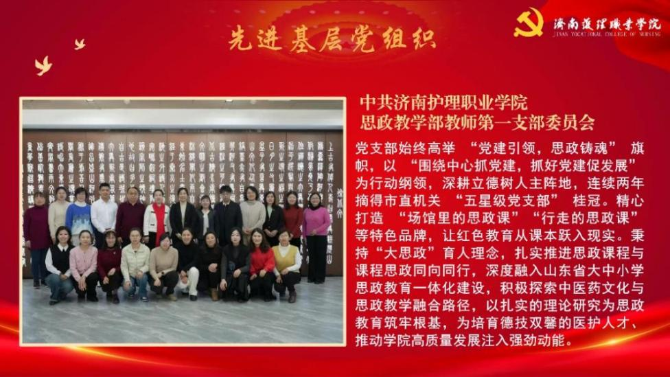 定期开展“三会一课”、政治理论学习,党员谈心谈话实现全覆盖;党建品牌建设成效显著:党总支获学院第一届“党建品管圈” 创新项目大赛三等奖,教师在“我来讲党课”等活动中获院级二等奖2项、三等奖3项;深化校社校际合作,与社区共建 “思政服务基地”,赴山东城市建设职业学院交流学习,1名教师入选济南市铸牢中华民族共同体意识优质课程展讲,1名教师参与市级主题宣讲。