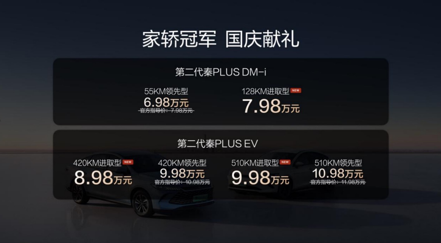 秦PLUS是目前A级家轿市场的绝对王者,树立了节能省油全球王者典范,累销超过150万辆,蝉联2023、2024年度家轿销量冠军,代表中国品牌打破合资垄断,一举改写市场格局,也让中国用户为开中国家轿而自豪,得到了网友“有路就有秦,有家就有秦”的赞誉。本次加推进取型,将让更多用户以更低门槛享受到高品质车生活,也为市场献上了一份国庆大礼。