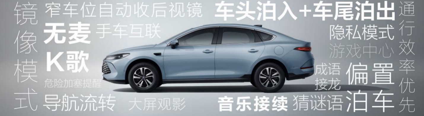 例如在行车辅助方面,新增了通行效率优先和危险加塞提醒功能;在智能泊车方面,新增车头泊入车尾泊出、窄车位自动收后视镜、偏置泊车等功能。智能座舱方面,不仅新增手车互联功能,支持镜像模式、大屏观影、音乐接续、导航流转、隐私模式等,未来还会新增萌宠桌面、游戏中心、无麦K歌、智能语音游戏等新功能,让秦PLUS成为了既能解压又能带娃的出行神器。