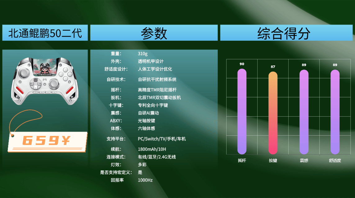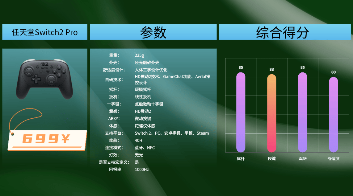 使用体验上偏实用、易上手,支持三模连接,并能一键唤醒Switch 2,多设备切换非常便捷;非对称震动配合多指位设计,在动作和体感游戏中更沉浸。续航方面1500mAh属于中规中矩,一场长游戏或连续几晚娱乐都能满足。机身稍重,但带来的稳固感让操作更稳定,不过长时间握持对小手玩家可能略有压力。