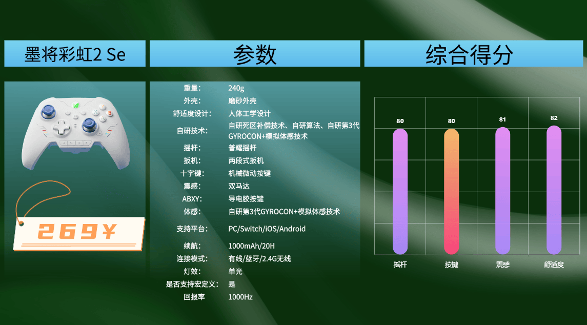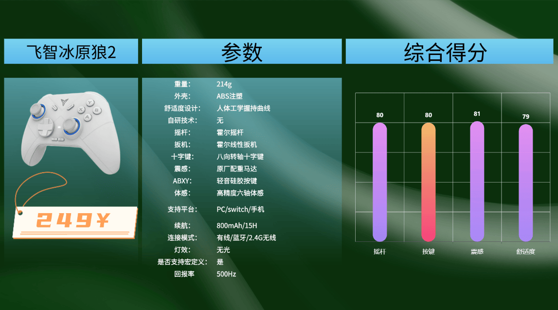 在核心性能方面,它针对FPS游戏优化,配备碳膜摇杆,支持2000级分辨率,有线模式1000Hz回报率(2.4G/蓝牙125Hz),操作更顺滑、微操精准,边缘金属环和自适应校准延长了使用寿命。十字键是可替换微动,响应清晰;顶部扳机为霍尔板机,阻尼感适中,并支持两段扳机锁切换。手柄支持三模连接,兼容PC、Switch、安卓及iOS设备,带陀螺仪,重量约240g,内置1000mAh电池续航约20小时。