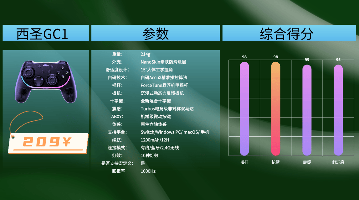 功能上,西圣GC1同样表现出色。0.5ms电竞级极速连接引擎+2.4G/蓝牙/Type-C三模,操作延迟极低、响应精准;原生六轴体感系统捕捉旋转、倾斜、挥动等动作,射击瞄准和赛车漂移更稳更准;214g轻量机身、15°握角、NanoSkin防滑涂层,长时间握持舒适稳固;半透明幻雾晶透机身+10种RGB灯效,科技感十足;全平台兼容手机、PC、Switch等设备,一机畅玩。整体配置扎实,真的是强悍到没有对手能超越。