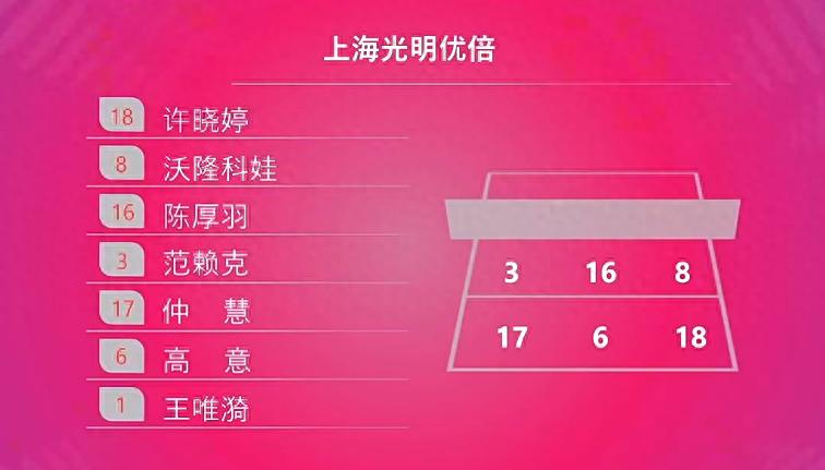 两队的首发阵容都在意料之中,上海女排是仲慧、沃隆科娃、范赖克、许晓婷、陈厚羽、高意和自由人王唯漪,江苏女排是吴梦洁、唐欣、周页彤、万梓玥、杨佳、张籽萱和自由人倪非凡。
