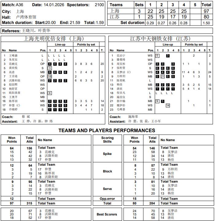 1月14日,在中国女排超级联赛第九轮,上海女排主场迎战江苏女排。双方的第一次交手江苏女排主场0-3告负。