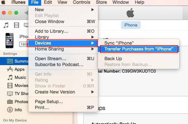 步骤4.转到顶部面板上的“文件”选项卡,然后选择“设备”选项。然后,从下拉菜单中选择“从iPhone传输购买内容”选项。