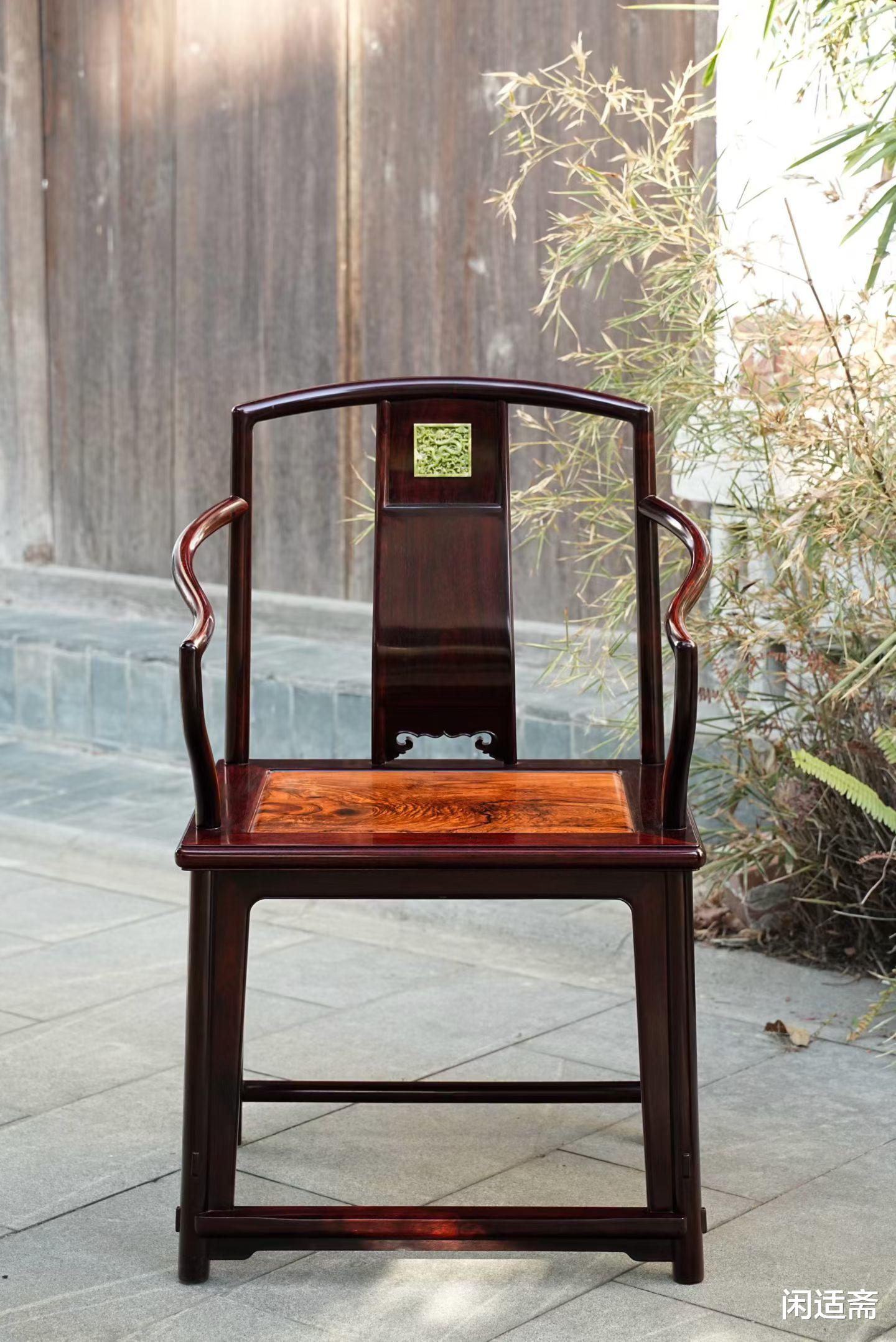这款南官帽椅既还原了明式家具的简约雅致,又以镶嵌工艺增添了器物的层次感。它可置于书房、厅堂,静坐其上,触的是百年木韵与玉石温润,赏的是山水纹的自然之美与龙纹的吉祥寓意,更能彰显藏者的深厚品味与文化底气。